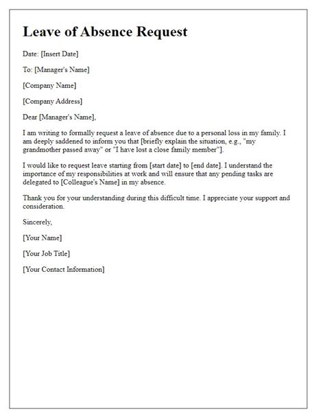 Here are 10 examples of bereavement leave requests: Here is a bereavement leave letter sample, written by an employee whose father has passed away. I am writing to formally request a period of bereavement leave following the recent passing of a close family member.